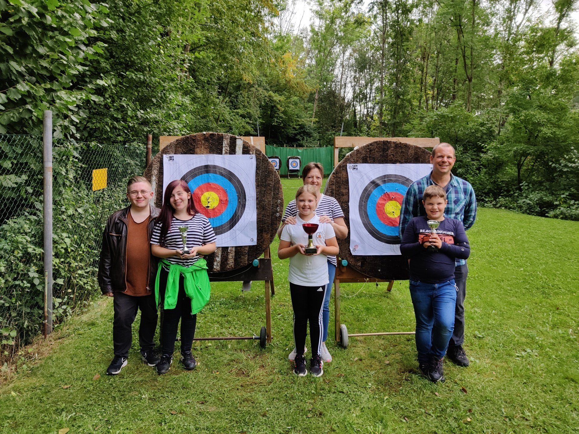 Am vergangenen Sonntag traf sich die Bogenjugend des SV Dettingen zur ersten Ausgabe des Bogen-Familienschießens. Glücklicherweise hörte es wenige Minuten vor Beginn zu regnen auf, sodass das Schießen wie geplant im Freien auf dem Bogenplatz stattfinden konnte. Im Zentrum dieser Veranstaltung standen die Jugendlichen, die in einer Trainingsphase ihren Familienmitgliedern beibringen mussten, was sie im Training erlernt hatten. In einer anschließenden Wettkampfphase traten die jeweiligen Familienteams gegeneinander an. Nach zwei Runden mit jeweils 3x3 Pfeilen stand das Ergebnis fest. Mit deutlichem Abstand gewann Frederike Doster zusammen mit Britta Doster, die 312 Ringe erreichten. Den zweiten Platz konnten sich Alexander und Torsten Reusch mit 256 Ringen sichern, und mit nur zwei Ringen weniger erreichten Ivana und Dario Jovic den dritten Platz. Bei Kaffee und Kuchen gab es Zeit und Raum sich besser kennenzulernen und einen gemütlichen Nachmittag zu verbringen. (V.F.)
